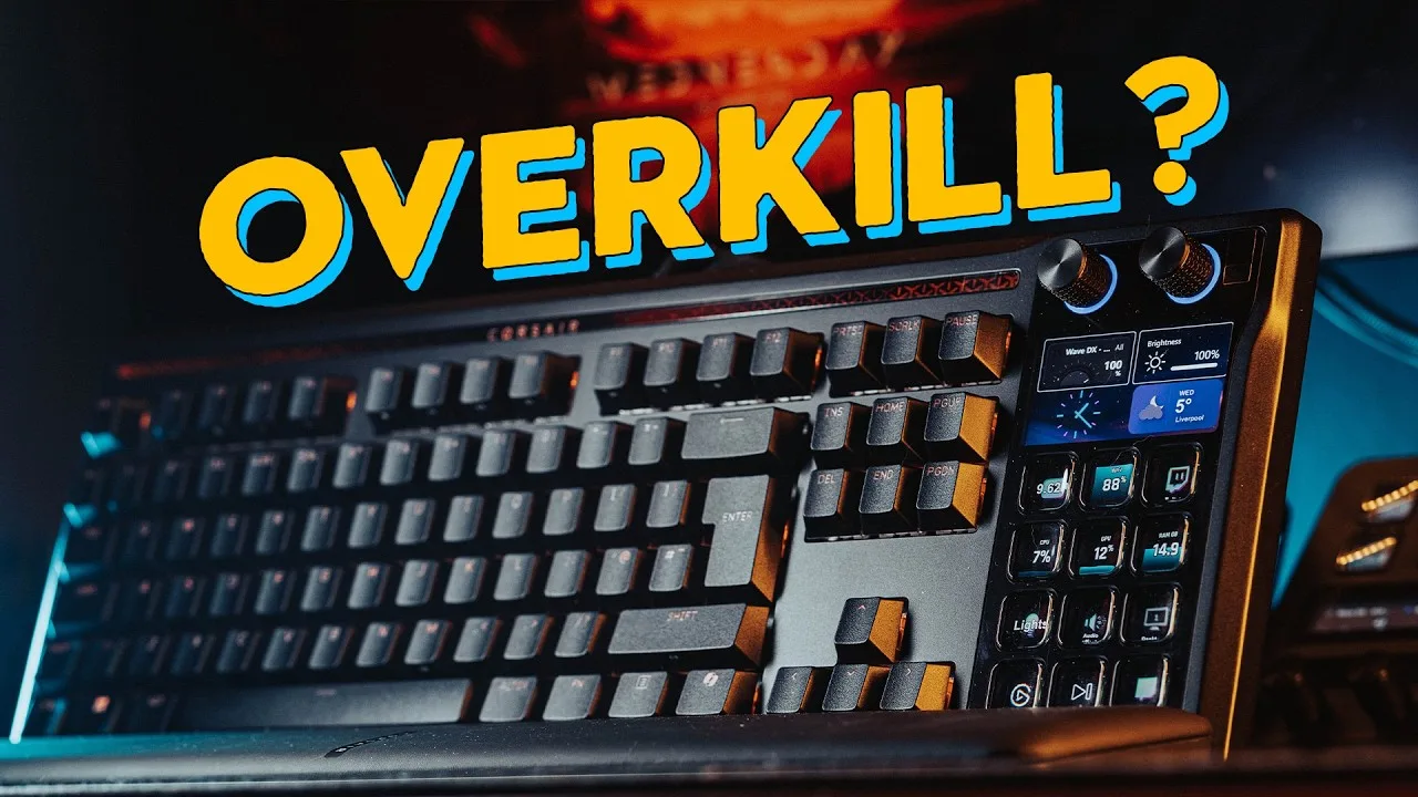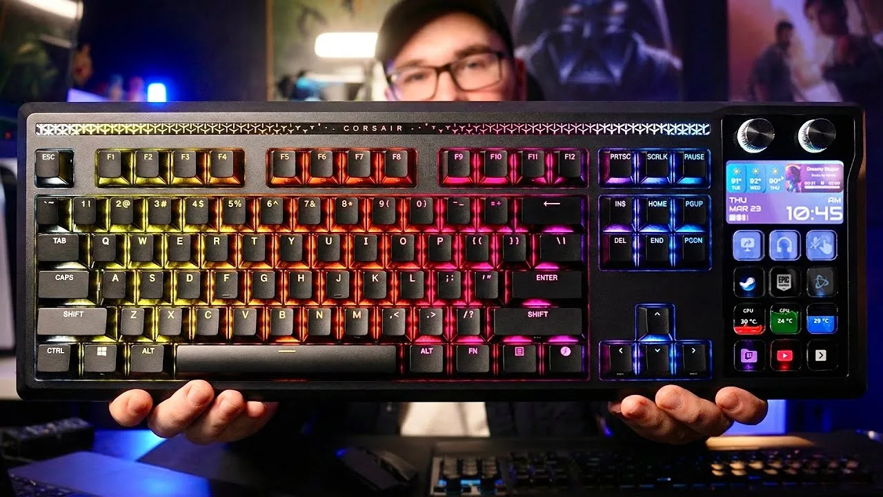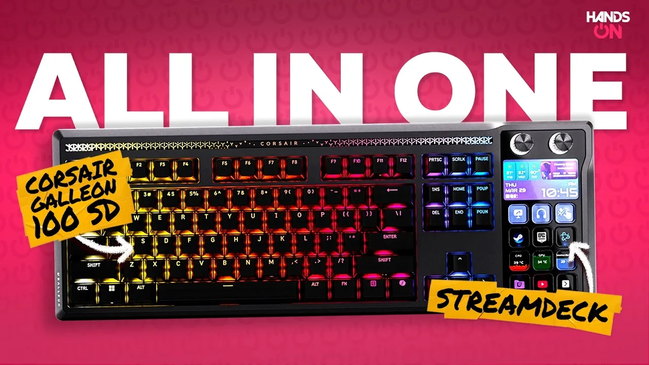 The Corsair Galleon 100 SD combines a high-end gaming keyboard with integrated streaming controls, priced at £300. It features 8,000Hz polling, MLX Pulse linear switches, hot-swappable sockets, and a built-in Stream Deck with 12 LCD keys, two rotary dials, and a color screen. The reviewer found it ideal for content creation due to its thocky, quiet sound profile that won't interfere with recordings. Dual USB-C cables enable USB pass-through for additional peripherals. Build quality is solid aluminum with sound dampening, per-key RGB, and a magnetic wrist rest. The main frustration is software conflict requiring iCUE to close when using the web-based configuration tool.