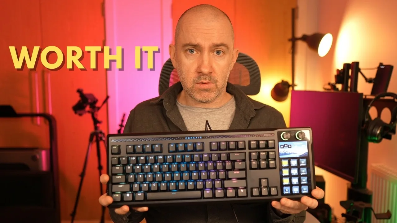 The reviewer enthusiastically discusses the Corsair Galleon 100 SD, a high-performance gaming keyboard featuring a built-in Elgato Stream Deck with twelve customizable keys and a top display for widgets. Priced at $350, it targets streamers, content creators, and gamers with 8,000Hz hyper-polling AXON technology, flash tap SOCD for directional inputs, and deep software integration for controlling audio, Discord, system stats, and streaming workflows. The reviewer expresses regret over purchasing a SteelSeries Apex Pro TKL instead of waiting for this product, praising its versatility across game genres and professional creative applications.