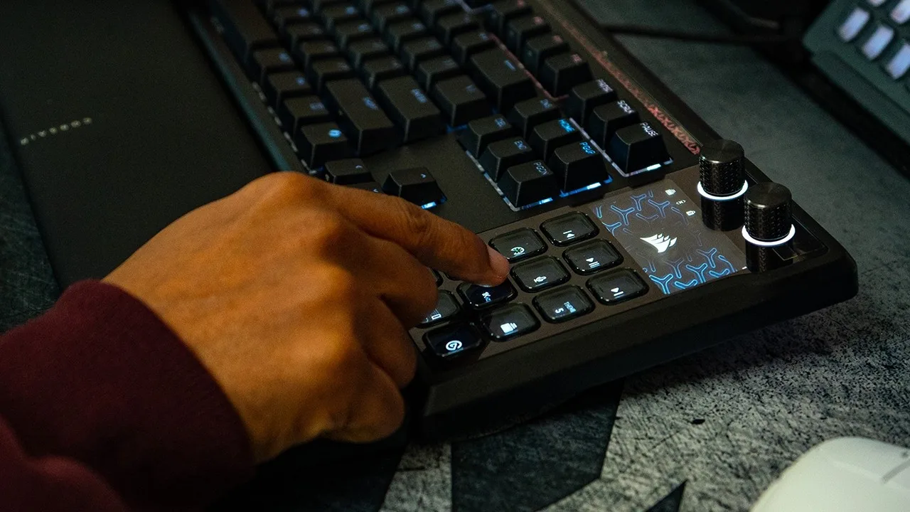 The Galleon 100 SD integrates a full gaming keyboard with a built-in Stream Deck, featuring 12 shortcut keys, two multi-function dials, and a 5-inch customizable display. It employs a premium gasket-mounted design with six layers of sound dampening, MLX Pulse Linear switches, and 8kHz hyper-polling for competitive performance. FlashTap SOCD handling prevents conflicting inputs for cleaner movement. The keyboard uses durable PBT keycaps and includes a cushioned palm rest. Configuration runs through Corsair WebHub, a browser-based tool requiring no installation, with support for Windows 11 dynamic lighting. The Stream Deck functionality extends beyond gaming to app launching, Discord integration, and media control.